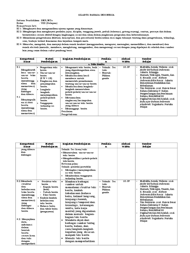 Sebenernya ane bingung mau post apa, karena kuota ane lagi boros. Berikut ini admin bagikan silabus dan rpp bahasa indonesia kelas 7, 8, dan smp mts kurikulum 2013. Di artikel ini, kursiguru akan membagikan file silabus kepada kamu yang sedang menjadi guru bahasa indonesia kelas 8. Rpp dan silabus bahasa indonesia kelas x kurikulum 2013. 3.1 menemu kan informasi secara cepat dan tepat dari ensiklopedi/ buku tele pon dengan membaca memindai. Berita dapat diartikan sebagai kabar atau laporan pers. Bertemu lagi dengan kami disini. Berita bertujuan untuk menyampaikan informasi yang umumnya bersifat faktual dan terbaru. Silabus marbi bahasa indonesia kelas 8 / silabus marbi bahasa indonesia kelas 8 : Silabus bahasa indonesia smp kelas 8 kur 13 edisi revisi 2019 terdiri dari 3 model yakni model 1 dengan 8 kolom, model 2 dengan 7 kolom dan model silabus mapel bahasa indonesia kelas 8 k13 revisi 2019/2020 ini di buat dengan menggunakan aplikasi pengolah kata ms word sehingga dapat. Marbi mahir berbahasa indonesia untuk smp mts kelas viii. Rpp dan silabus mapel bahasa indonesia smp kelas 7,8,9 ktsp semester 1 dan 2 | selamat datang diblog kami, sebelumnya saya ucapkan selamat. Perangkat pembelajaran khususnya silabus merupakan perangkat pembelajaran yang sangat penting bagi seorang guru mata pelajaran.
